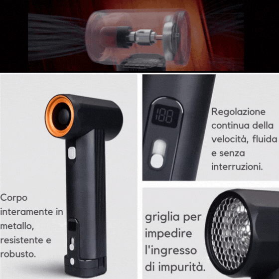 Dimentica i giocattoli in plastica. Il Jet Fan Turbo è equipaggiato con un motore a turbina da 785W che genera una spinta di 900g. È abbastanza potente da asciugare un'intera auto in pochi minuti senza toccarla, evitando i graffi dei panni (swirl marks).